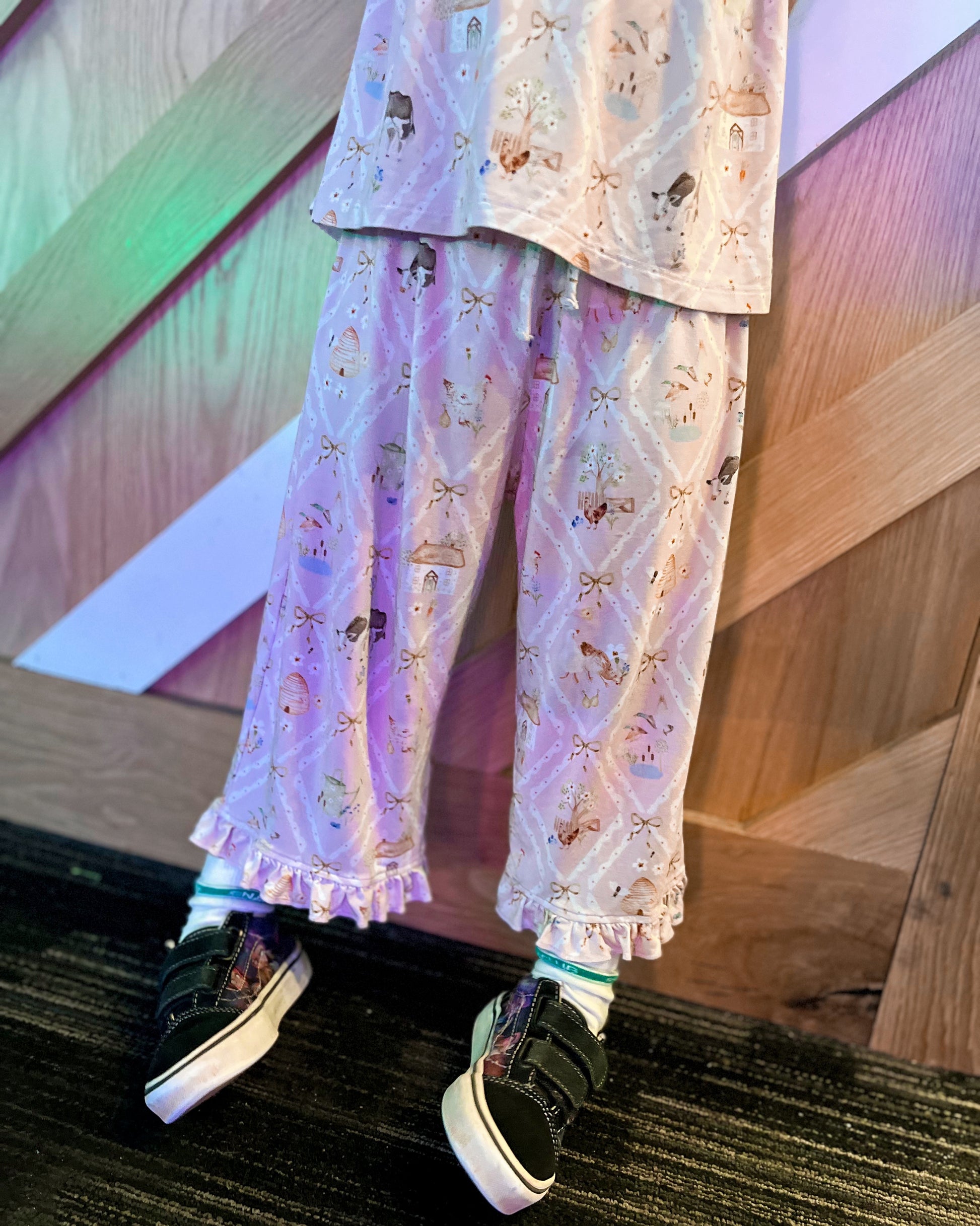 The perfect outfit for the countryside! Adorable buttery soft bamboo set featuring a cami top with adjustable straps and wide leg culotte pants with an elastic waistband and ruffle trim. Decorated with the cutest whimsical cottage themed prints all over!